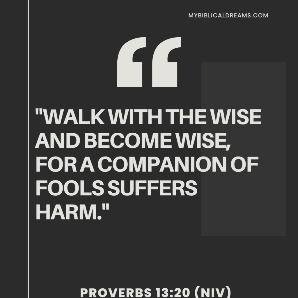 This verse emphasizes the transformative power of relationships: “Walk with the wise and become wise, for a companion of fools suffers harm.” It highlights the importance of surrounding oneself with individuals who exhibit wisdom and godliness, as their influence will foster growth and maturity in one’s own character.