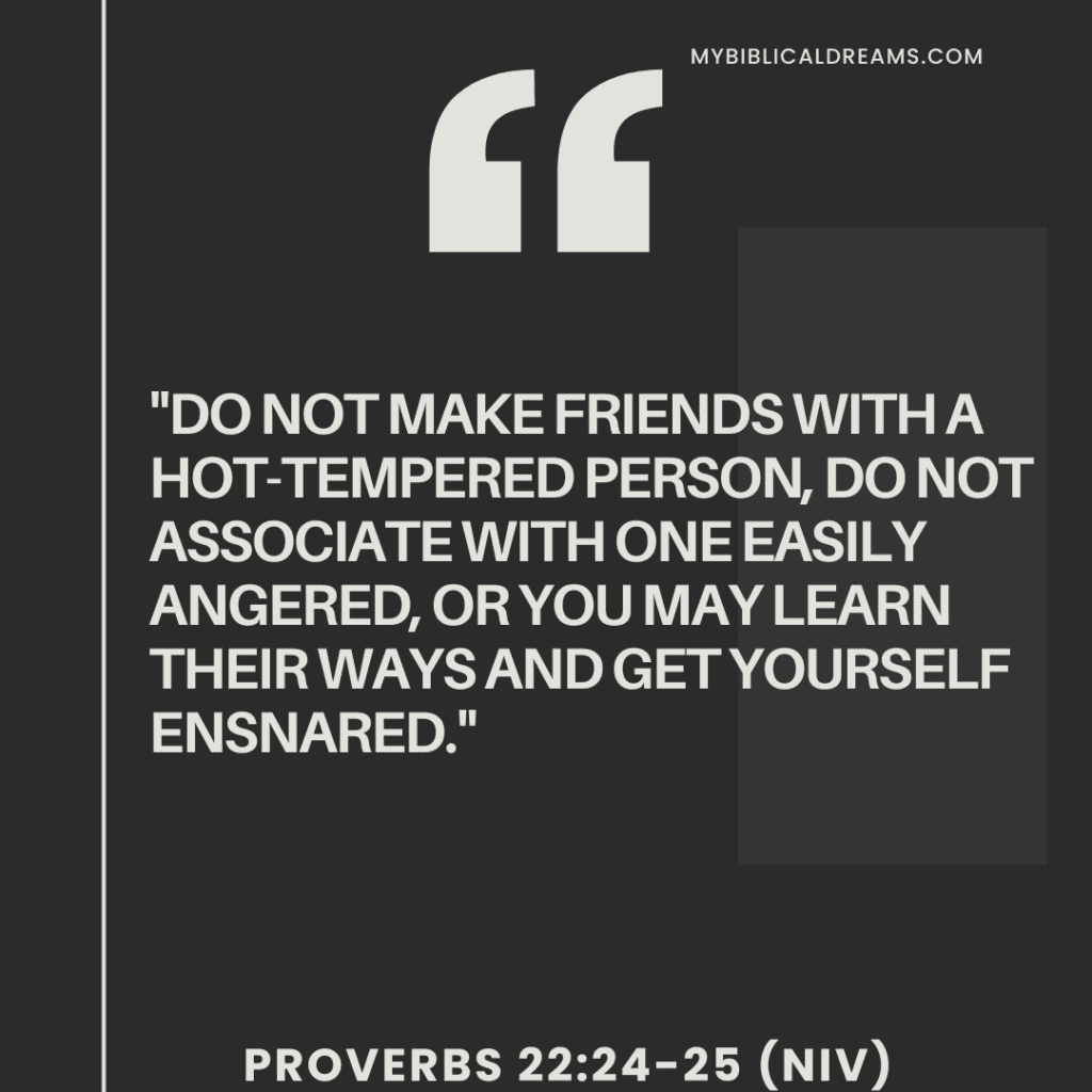 This verse advises against forming close relationships with individuals prone to anger, warning of the potential for their temperament to influence your own. It underscores the ripple effect of character and behavior within relationships.